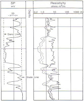 La curva del SP registra el potencial eléctrico producido por la interacción entre el agua de formación, el fluído de perforación (conductivo) y lutitas, este voltaje es resultado de una corriente contínua que se genera en dichos bordes por la diferencia de salinidad.
